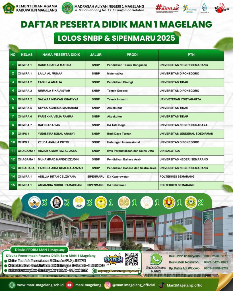 Sebanyak 11 peserta didik MAN 1 Magelang mengikuti Babak Final Olimpiade Sains Madrasah (OSMA) Tingkat Provinsi Jawa Tengah Tahun 2025 yang diselenggarakan secara serentak pada Sabtu, 31 Mei 2025. Kegiatan ini mendapat . . . 0